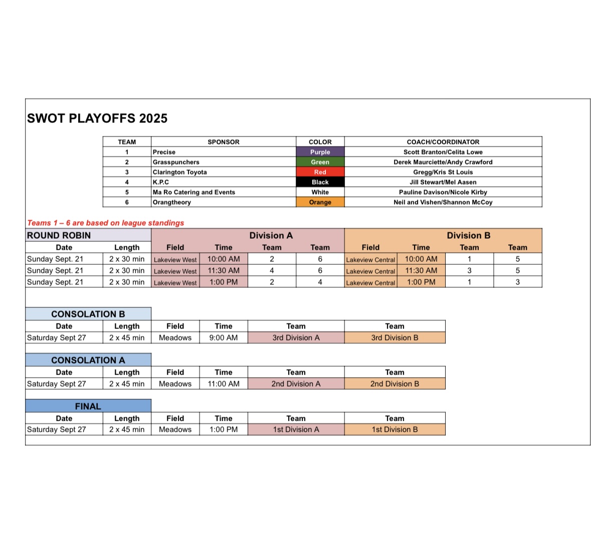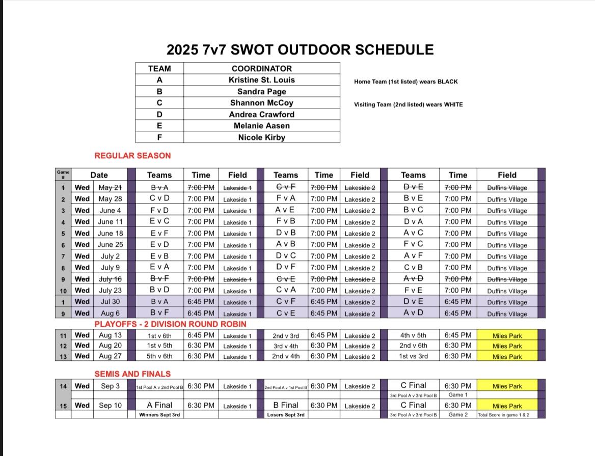 Players and coaches are encouraged to show sportsmanship to each other and ensure that everyone has an opportunity to enjoy this league. In the event that the committee believes that this is not occurring, repeated offenders may be asked to leave the SWOT league.