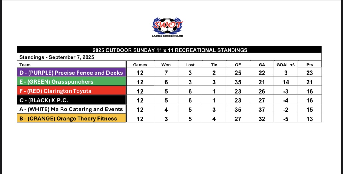 Please be aware that standings posted in the website are based on games played, total points then goal differential. Due to the website systems limitations the “untie” rules cannot be applied as per rule 10 and 11 included in the outdoor rules tab. Therefore, the standings will be determined manually whenever there is a tie.